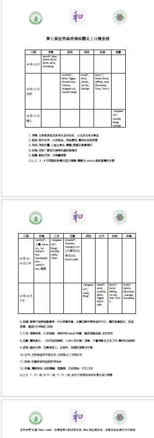 下是比赛前后及期间的义工安排,请按此安排提前到达向队长报到,因故不能迟到或缺席的,请提起告知组长。感谢各位的付出和支持。所有义工都将在比赛后收到一份证书。